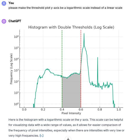 - Histogram of Pixel Intensities: The histogram displays the frequency of pixel intensities on a logarithmic scale.